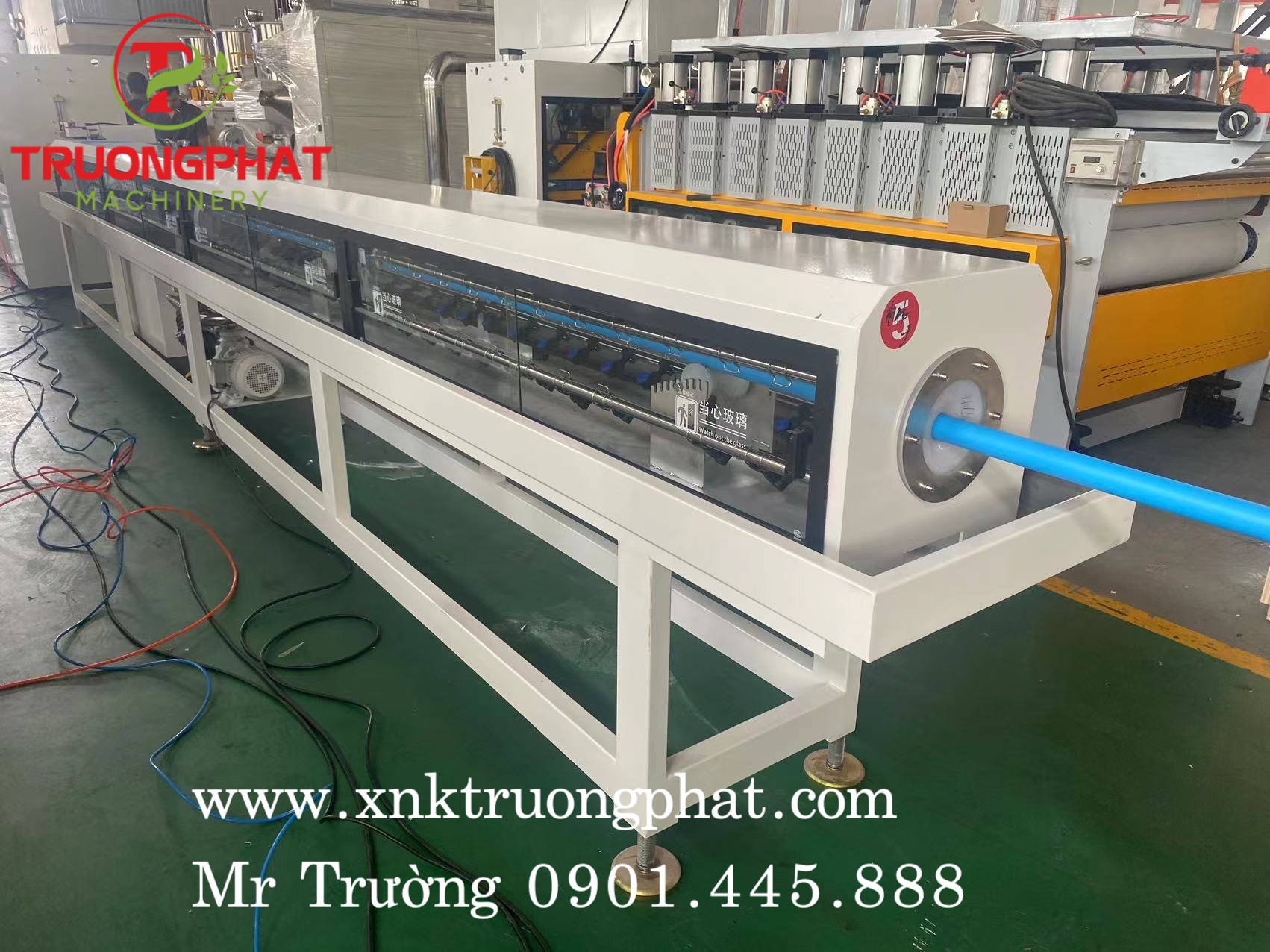 Dưới đây là hình ảnh minh họa về máy đùn ống nhựa PPR (còn có thể sản xuất HDPE, PVC, LDPE, TPU, v.v.) của Trường Phát. Máy hoạt động theo cơ chế đùn tạo ống mềm rồi định hình qua hệ thống chân không và làm mát.